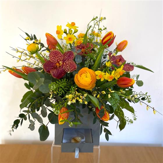 Please note that due to the seasonal availability of flowers it may be necessary to vary individual stems from those shown. Our skilled florists may substitute flowers for one similar in style, quality and value. The wrapping of our flowers will vary from the images on our website, you may specify if you would like your flowers wrapped in paper or a specific colour of cellophane, but this is not always guaranteed due to product change and availability. Where our designs include a sundry item like a Floral box, vase or basket it may not always be possible to include the exact item as displayed. If such an occasion arises we will make every effort to replace the item with a suitable alternative.