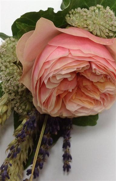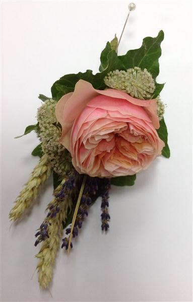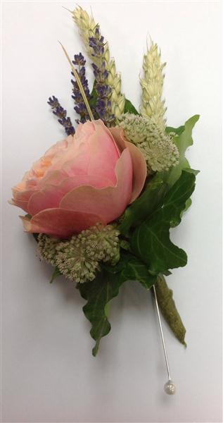 A beautiful Vuvuzela Rose boutonnière with Lavender, wheat and Astrantia