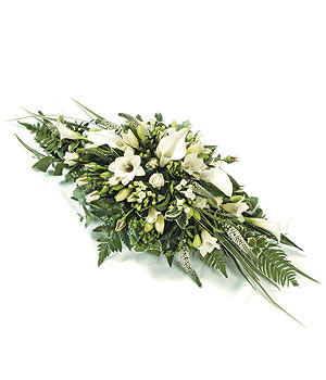 Childs spray with white calla lilies and freesia and spray roses with complimentary foliage. Size: Width - 61cm (24").