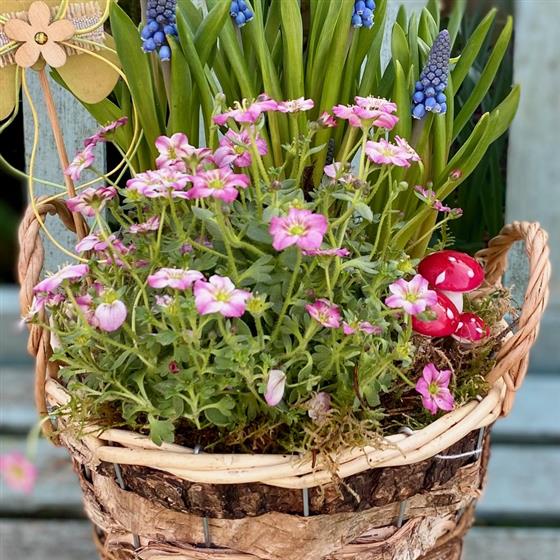 Bring the beauty of spring into your home or garden with this delightful Spring Woodland Basket Garden. Arranged in a rustic birch-style woven basket, this charming planter features vibrant blue grape hyacinths (Muscari) rising above a bed of delicate pink flowering plants, creating a fresh and colorful seasonal display.