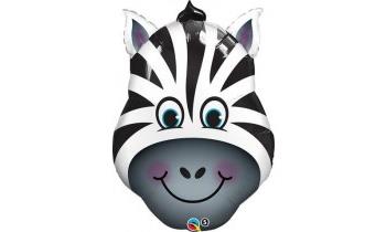 Zebra head supershape balloon, helium filled and on a heavy balloon weight.