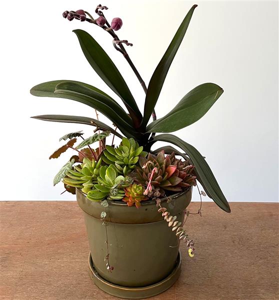 Set in a modern ceramic pot, this miniature indoor garden blends soft orchid blooms with the architectural textures of succulents for a calm, elegant display. Long-lasting and easy to care for, it makes a thoughtful gift or a sophisticated statement for the home or office.