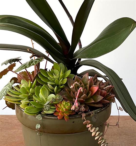 A sculptural planted arrangement featuring a graceful Phalaenopsis orchid complemented by a curated selection of succulents and trailing foliage. Natural twisted branches add height and movement, creating a striking, contemporary design.