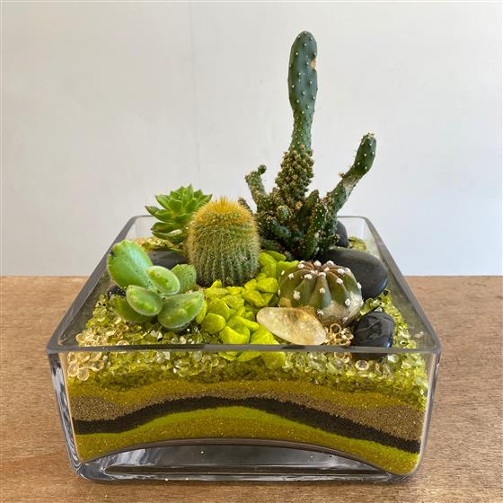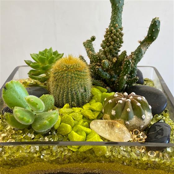 A vibrant cacti and succulent display in green, gold and black sand. Decorated with diamante chippings, decorative stones and mood stones.