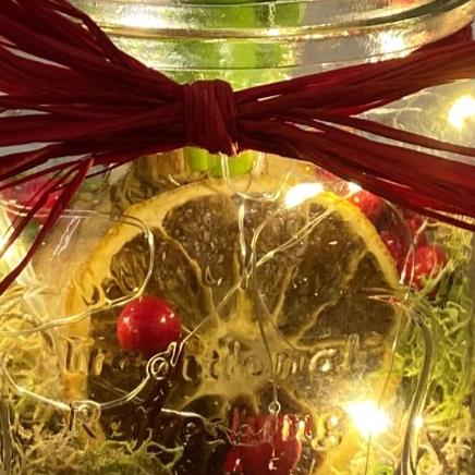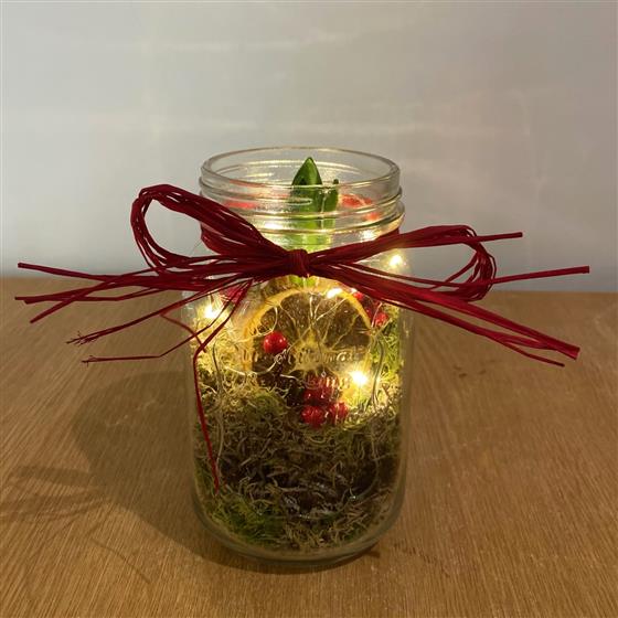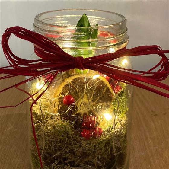 A fun display in a Jam jar. A pretty white Hyacinth with cones and berries and lights. The perfect gift or addition to your home.