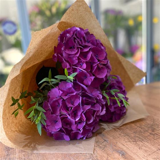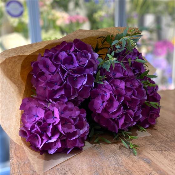 A simple tied design of beautiful purple Hydrangeas and Eucalyptus, wrapped in craft paper ready to be placed into a vase.
