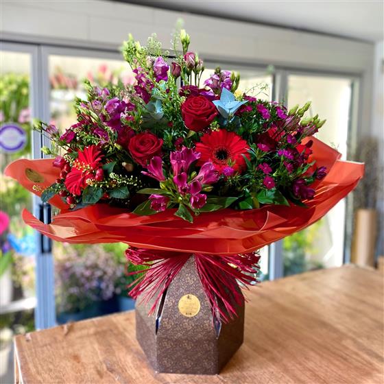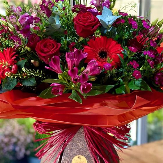 A magnificent display of red and deep pink blooms- sure to impress anyone who receives this stunning bouquet.