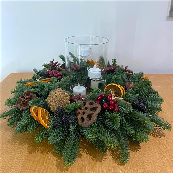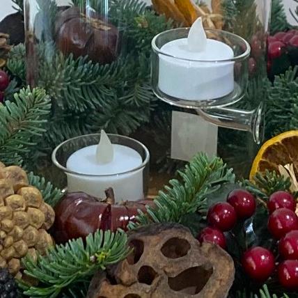 A beautiful fresh pine display with 3 tea light candle glass Cylinder.