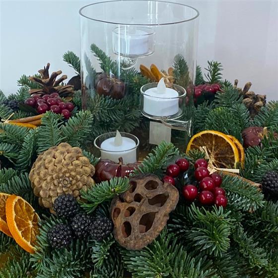 Fresh pine, natural cones, Lotus heads, Orange slices, Berries and Cinnamon.
