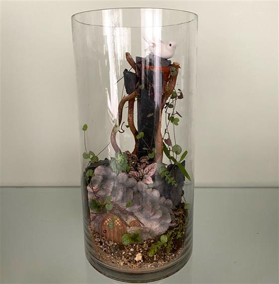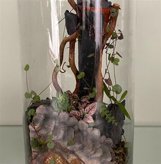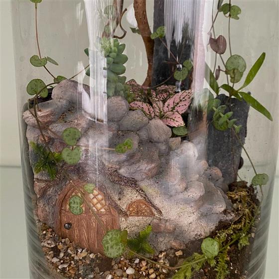 An amazing gift and talking point. Plants are Fittonia, Sedum, Ceropegia and moss. Happy in a bright spot with some sunshine.