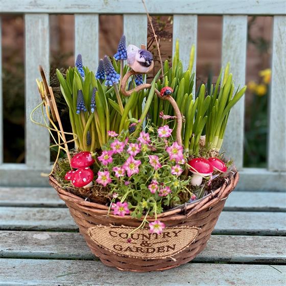 Our Spring Country Basket is a charming planted arrangement that captures the fresh beauty of the season. Set in a rustic wicker basket with a “Country Garden” detail, this delightful display features vibrant spring bulbs, including striking blue muscari and lush green shoots, complemented by delicate pink flowering plants.